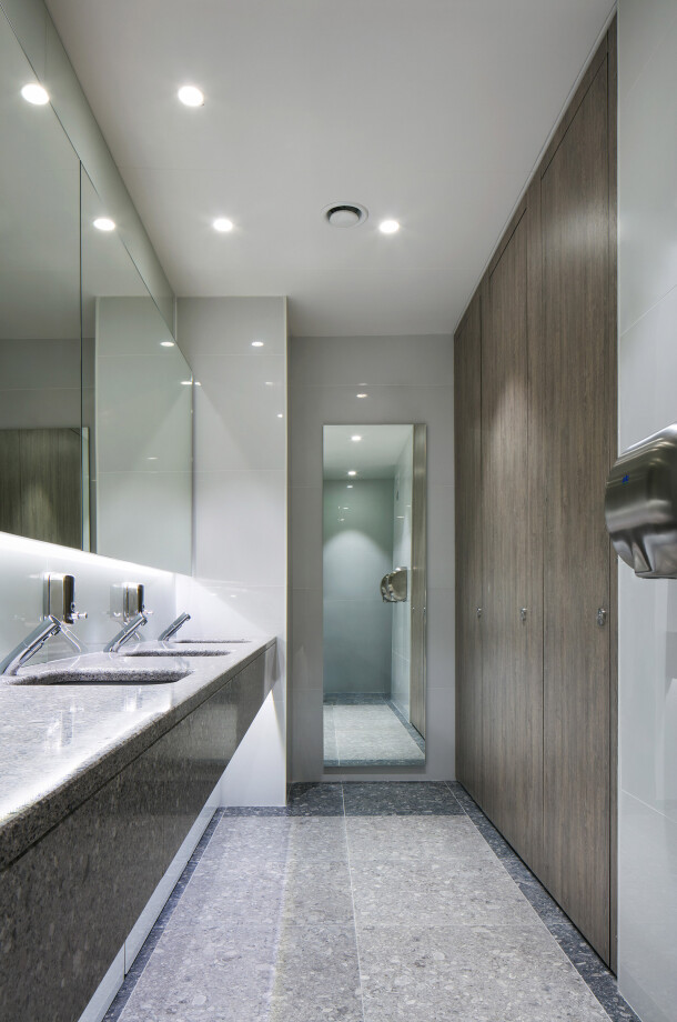 A memorable entry is created by a south-facing double-height reception area, without impeding on the private first floor meeting spaces above. Meanwhile, a contemporary palette of materials and graphics continues through a new coffee shop, lift lobbies, stairwells, restrooms, and changing facilities.