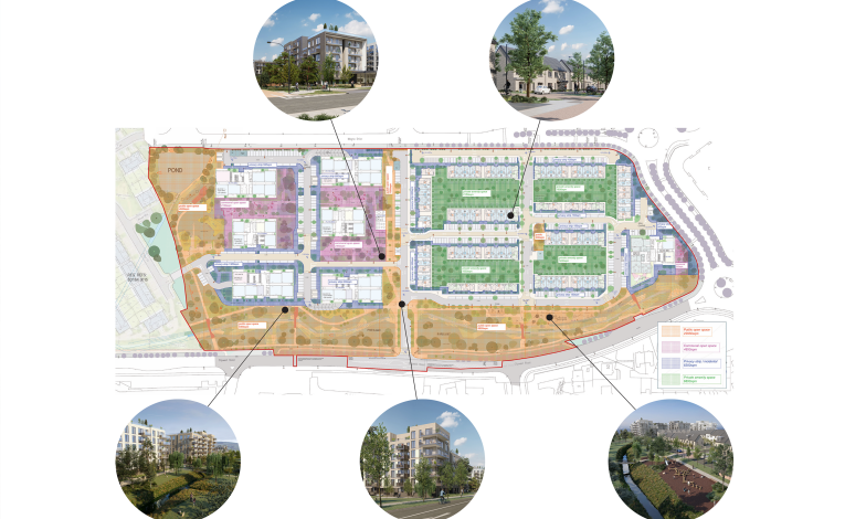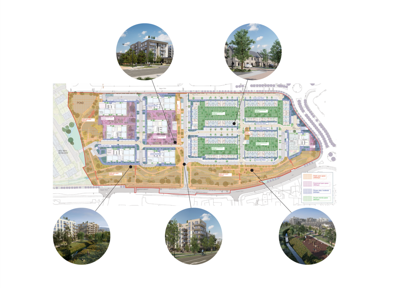 The proposal consists of two distinct areas to the north and south, each defined by a series of buildings with different architectural typologies, overlooking private and public landscaped spaces. The landscape will serve both existing and proposed residences in the area, blending large public parks with branching green landscaped paths.
