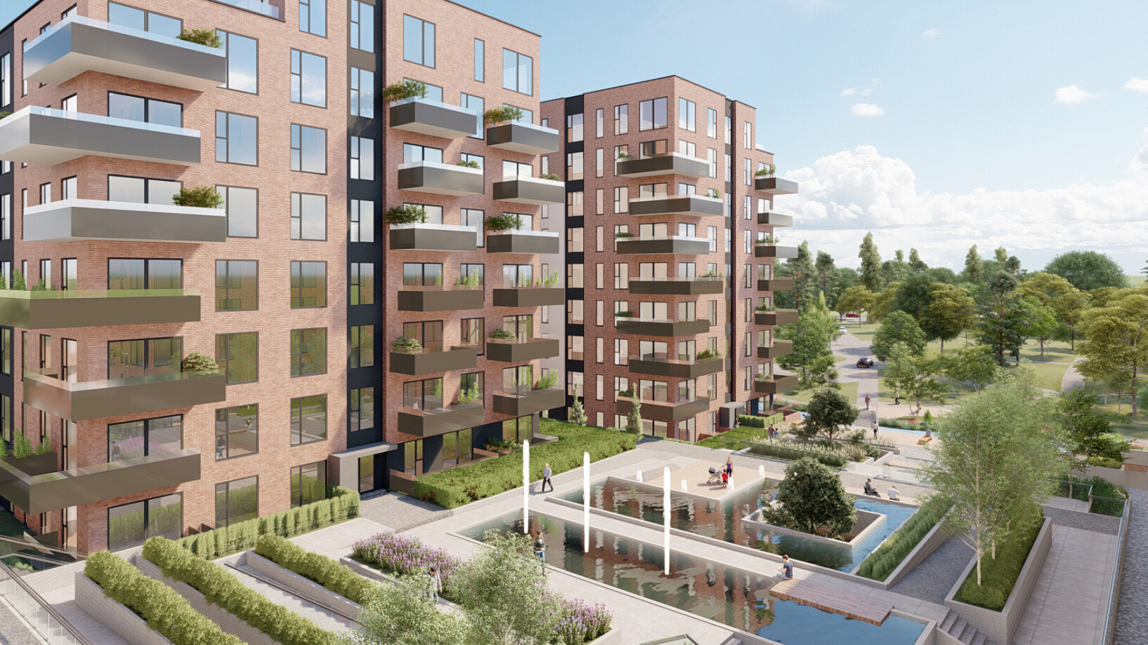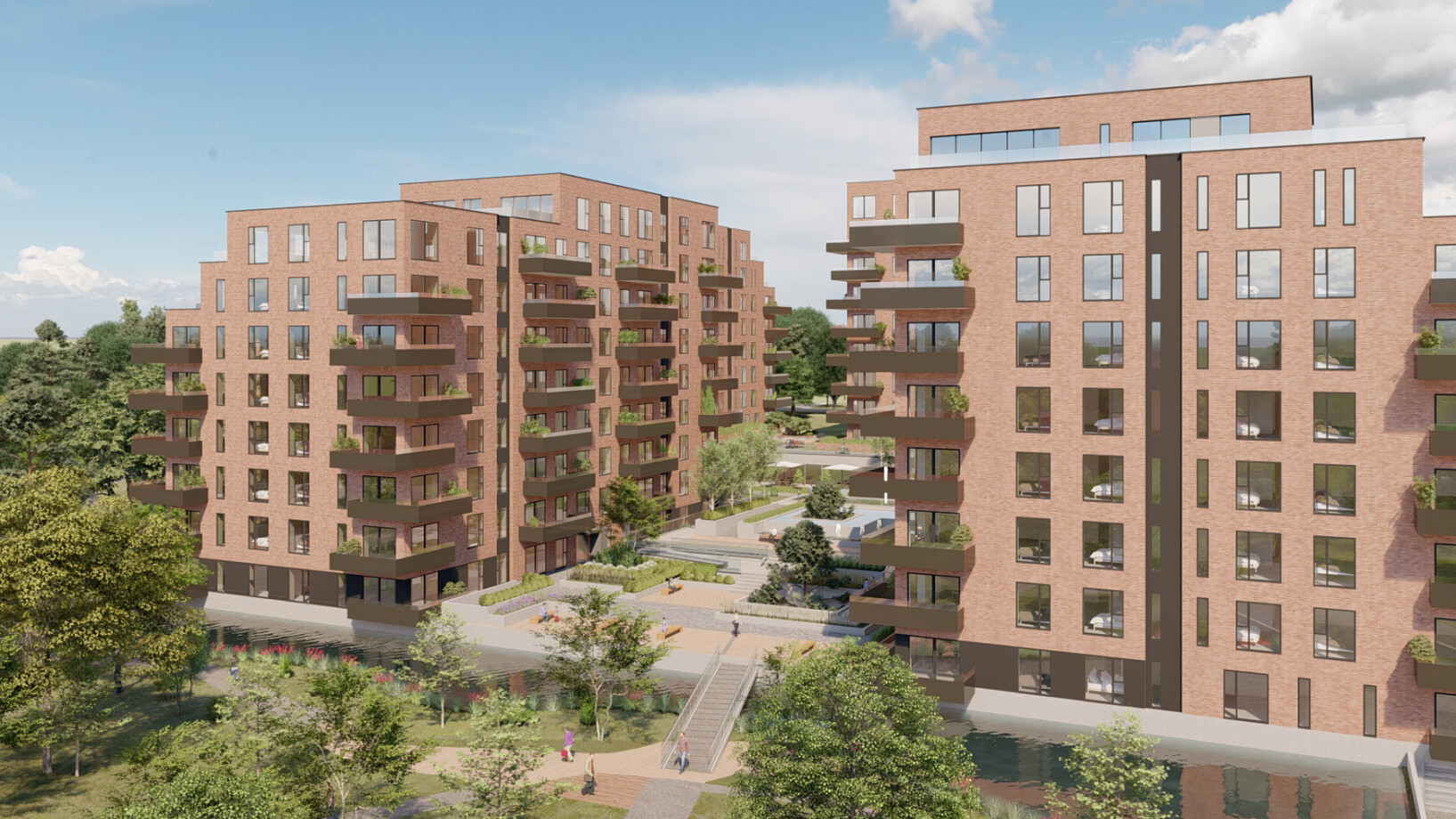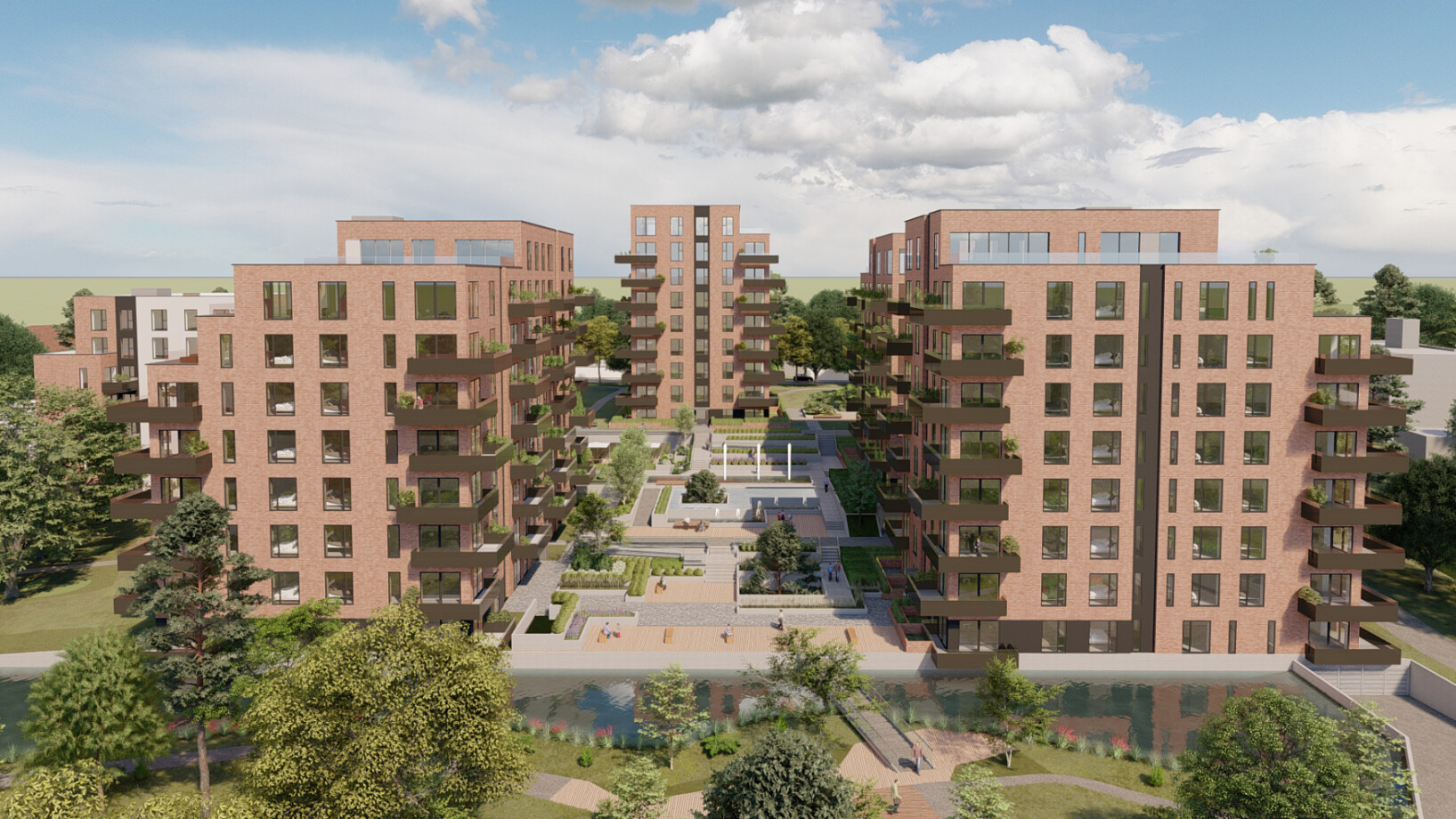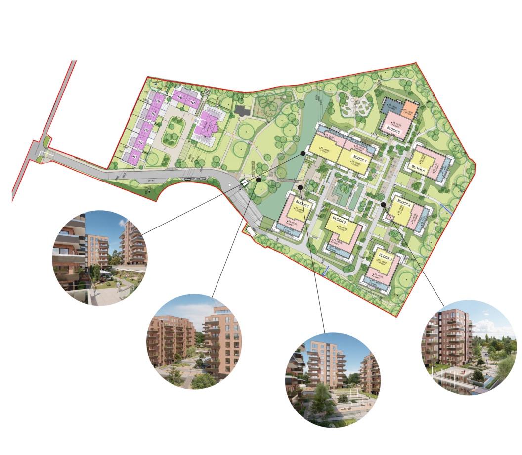 The scheme has been carefully designed to create a sustainable, well-orientated, varied mixtures of houses, and 1, 2 and 3 bedroom apartments. At the heart of the scheme, an existing water feature has been realigned to form a large naturalized pond, spanned by a bridge which forms the primary access for pedestrians.