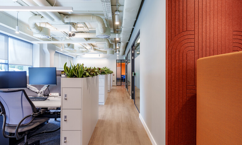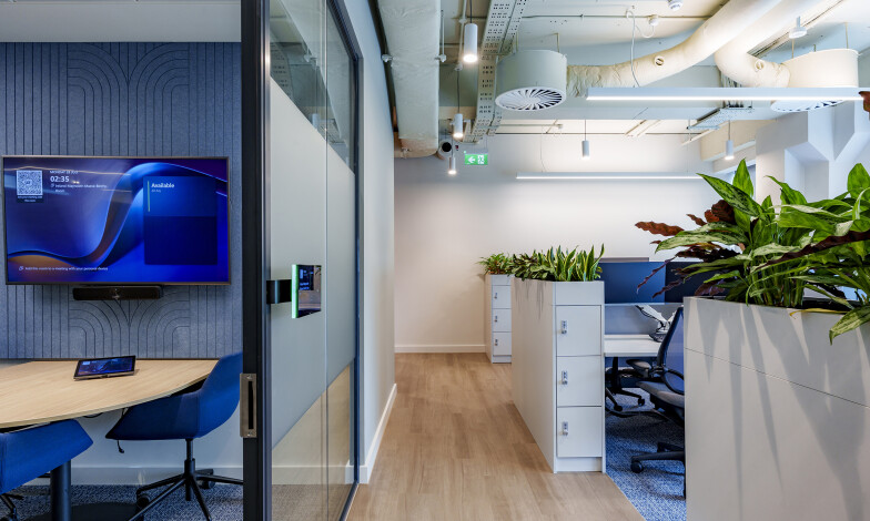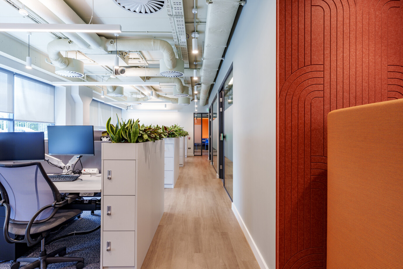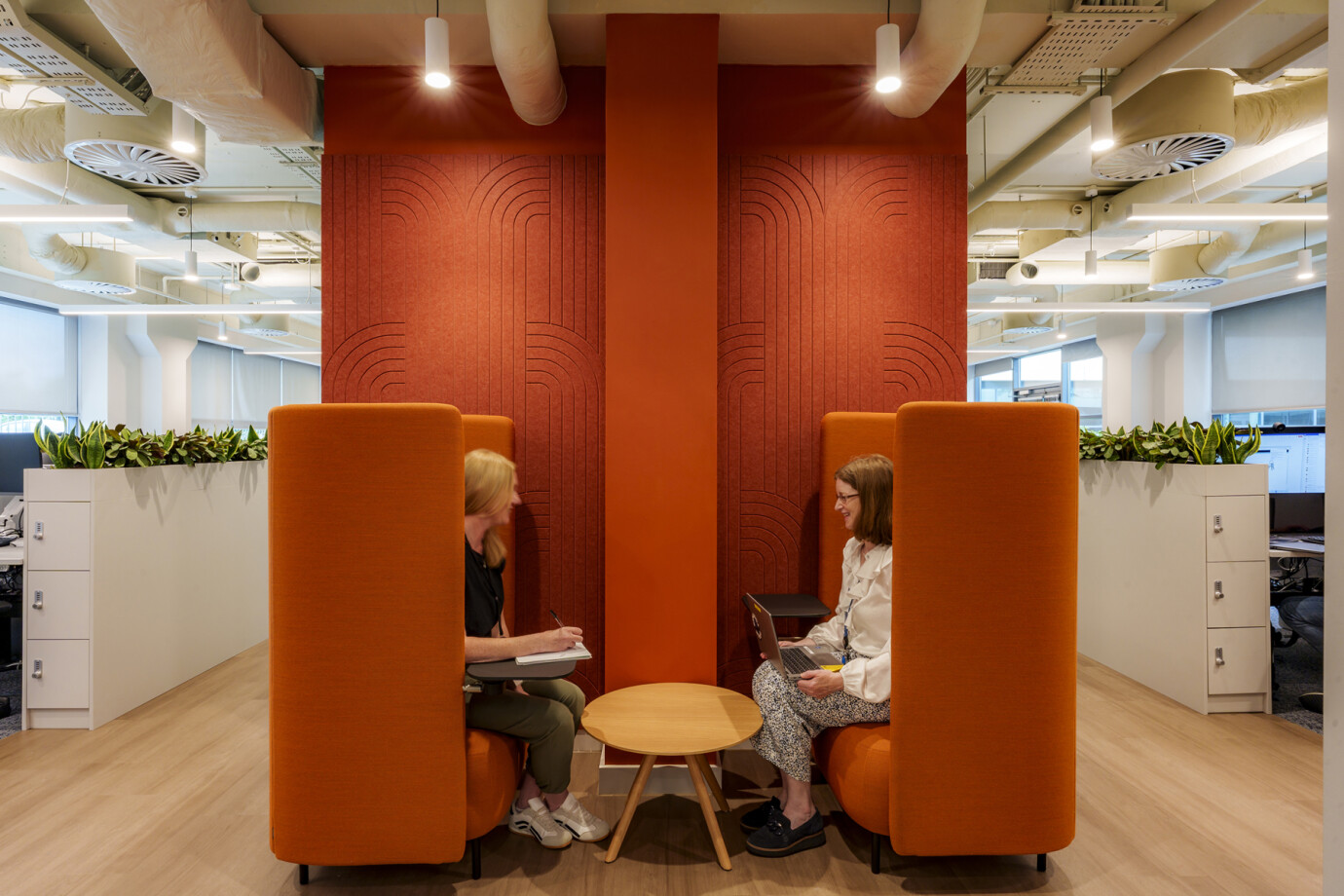 The fit-out integrates sustainable strategies, from material reuse to responsible specification, while promoting comfort, flexibility, and wellbeing. A central collaboration strip features phone booths and huddle spaces, complemented by openable windows and abundant natural daylight. Workstations overlook high-quality landscaping, with greenery incorporated throughout. The layout offers focus rooms, a fully equipped canteen, and diverse informal seating, supporting varied work styles and empowering users through adaptable, choice-driven environments.